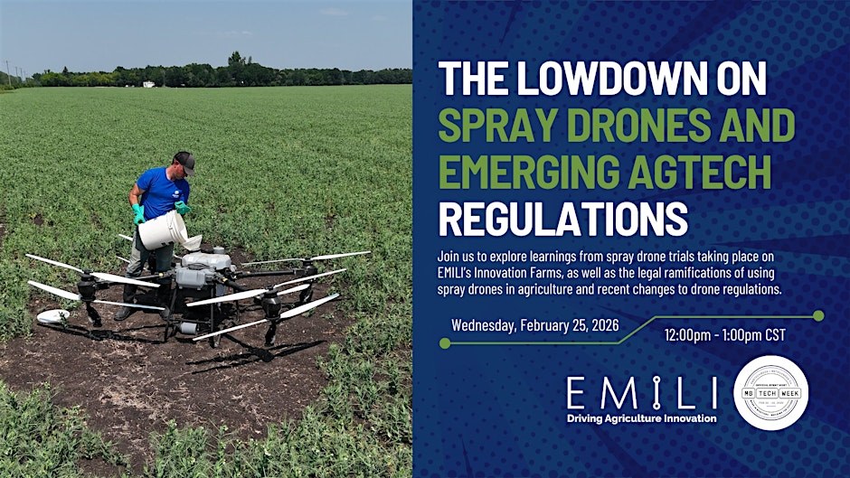 Ce webinaire explorera les enseignements tirés des essais de drones de pulvérisation menés sur les fermes d'innovation d'EMILI, ainsi que les implications juridiques de l'utilisation de drones de pulvérisation en agriculture et les récents changements apportés à la réglementation des drones, avec la participation d'Erika A Carrasco, avocate spécialisée dans les technologies émergentes chez MLT Aikins, de Kevin Falk, scientifique en modernisation des champs chez Corteva Agriscience, et de Leanne Koroscil, directrice des fermes d'innovation d'EMILI.