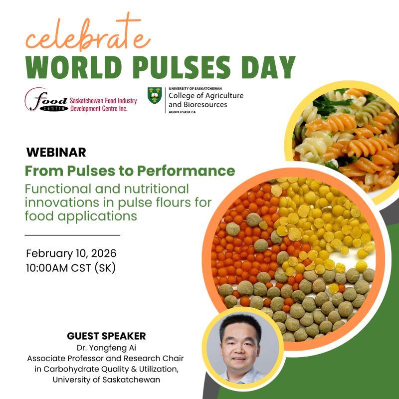 Le Saskatchewan Food Industry Development Centre organise un webinaire sur les propriétés fonctionnelles de la farine de légumineuses pour une vaste gamme d'applications alimentaires, animé par le Dr Yongfeng Ai, professeur agrégé à l'Université de la Saskatchewan.