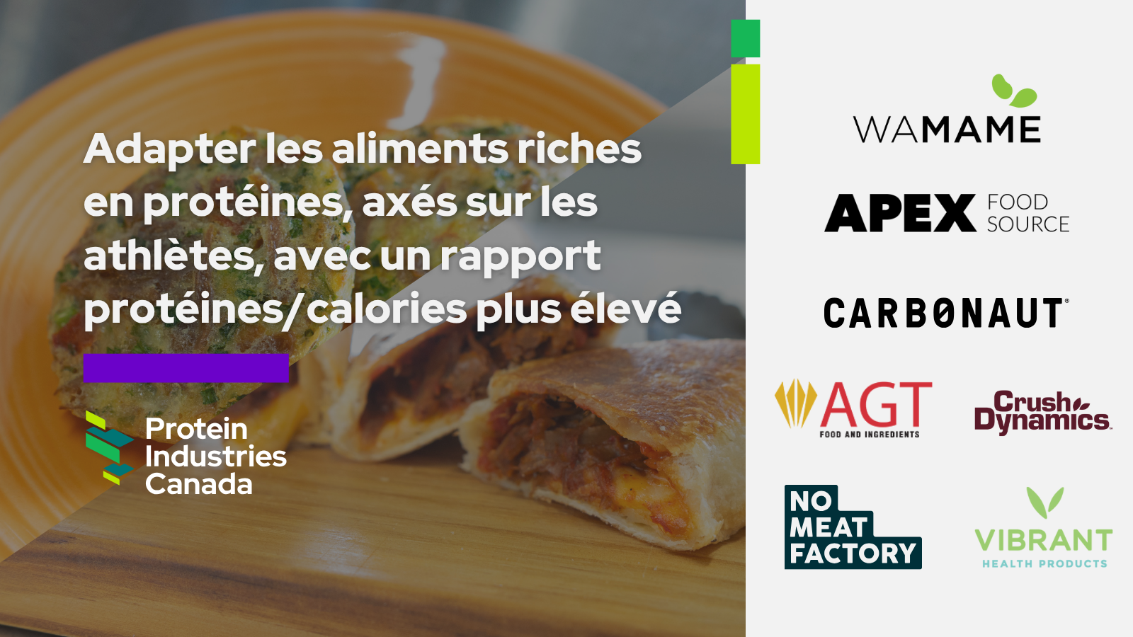 En collaboration avec les partenaires du projet Apex Food Source, Crush Dynamics et AGT Food and Ingredients, Wamame Foods utilise des ingrédients canadiens pour développer, commercialiser et mettre à l'échelle une nouvelle gamme de produits alimentaires fonctionnels et riches en protéines, tels que les burritos riches en protéines, qui sont axés sur les athlètes. dépasse le rapport protéines/calories de la barre protéinée américaine moyenne. Bientôt disponibles dans une variété de points de vente à emporter en Amérique du Nord et à l'étranger, ces produits riches en protéines ajouteront une diversité de choix pour les athlètes et les personnes soucieuses de leur santé partout dans le monde et permettront aux consommateurs de savourer leur nourriture tout en conservant un style de vie d'élite. .