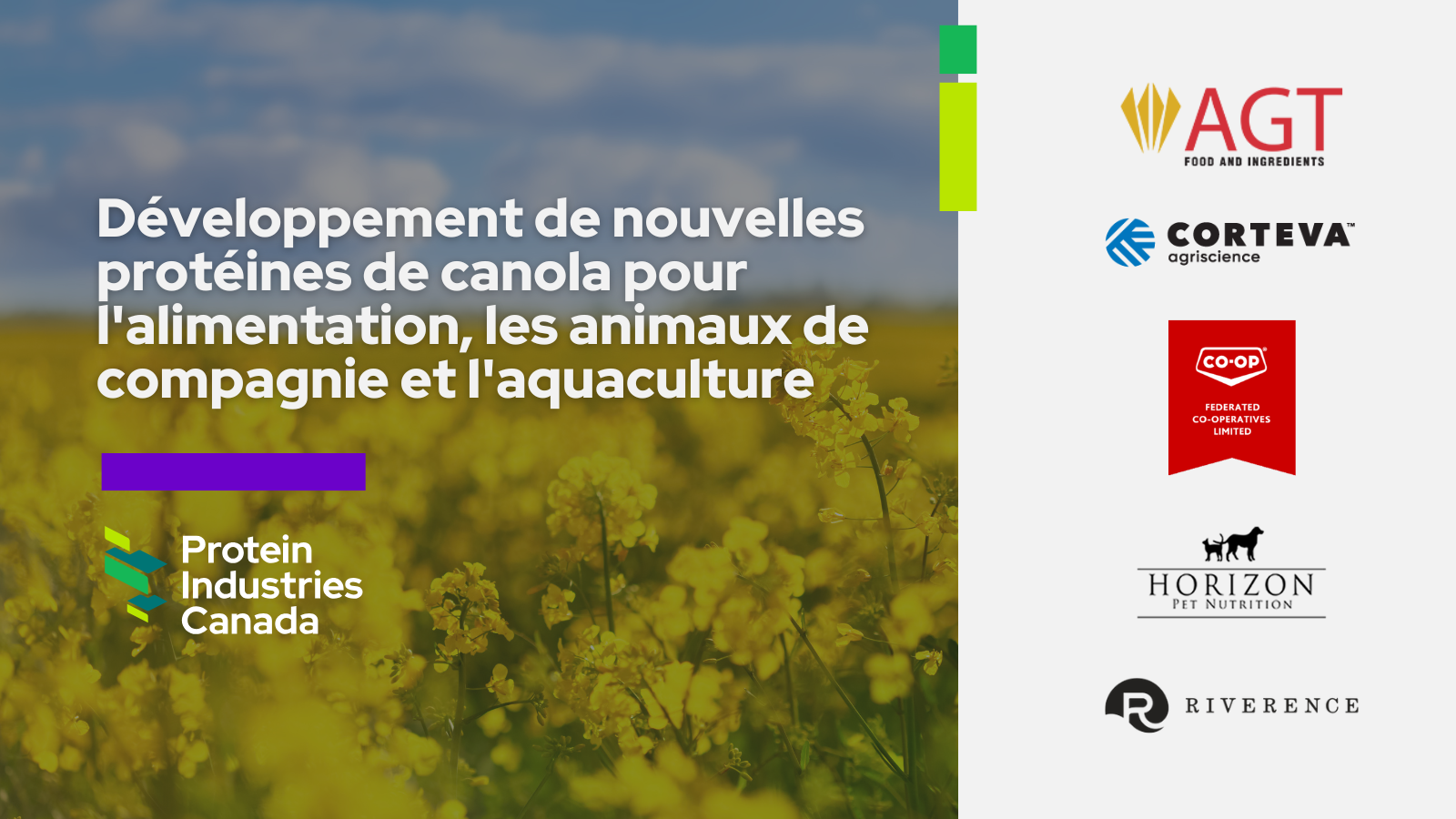 Grâce au développement et à la commercialisation d'un nouveau concentré de protéines de canola, les partenaires souhaitent accroître les débouchés de cette culture sur le marché canadien des ingrédients, tout en créant une variété de produits destinés à l'alimentation humaine et animale. Le projet utilisera la technologie existante d'AGT Foods pour développer et optimiser l'ingrédient, en mettant l'accent sur l'augmentation des teneurs en protéines et du rendement.
