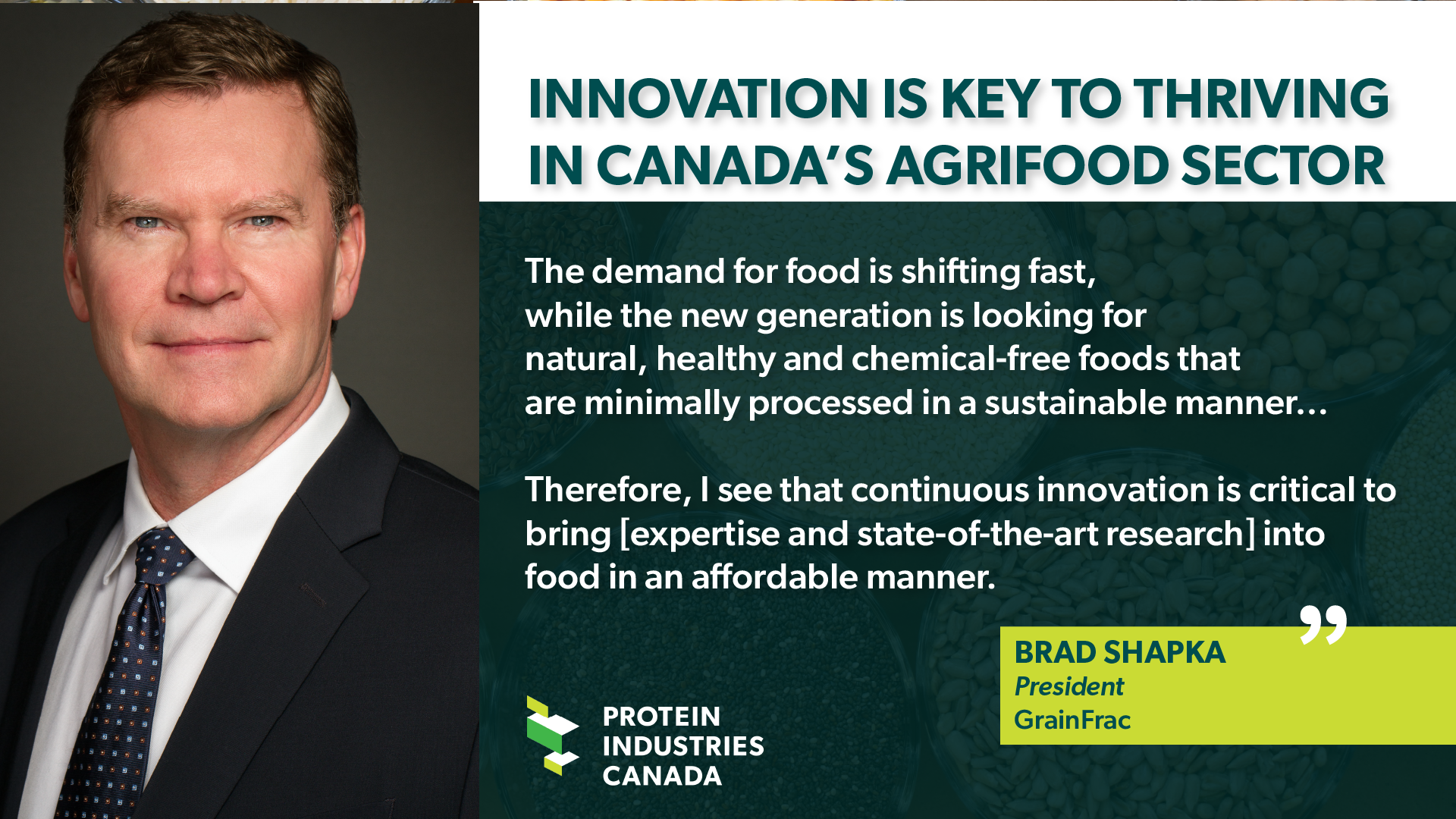 While utilizing university-developed intellectual property may not be the first strategy to come to mind for many organizations, Shapka cited it as an easy choice. He learned at an early age that innovation was an important part of thriving in Canada’s agrifood industry. He believes that one of the best ways to accomplish the type of innovation needed to provide the world with an increasing supply of healthy, sustainable protein is by partnering with all links in the value chain, including academic institutions.
