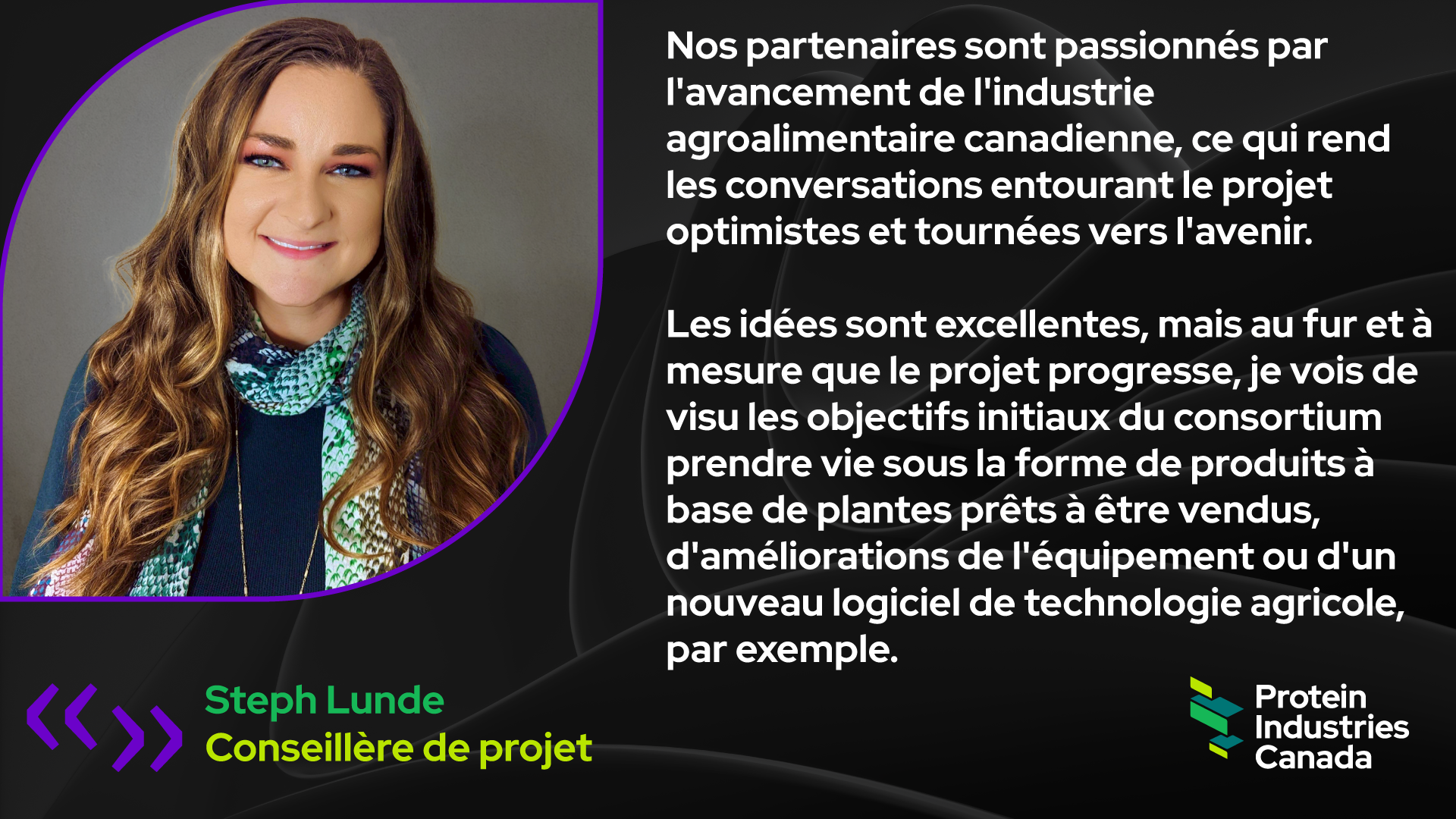 « Nos partenaires sont passionnés par l'avancement de l'industrie agroalimentaire canadienne, ce qui rend les conversations entourant le projet optimistes et tournées vers l'avenir. Les types de projets approuvés varient dans notre programme, ce qui rend chaque jour et chaque projet différent et fascinant », a-t-elle expliqué. « J'aime vraiment voir ces projets s'unir à notre équipe de développement, puis le flambeau est passé à un membre de l'équipe de gestion de projet de Protein Industries Canada. Les idées sont excellentes, mais au fur et à mesure que le projet progresse, je vois de visu les objectifs initiaux du consortium prendre vie sous la forme de produits à base de plantes prêts à être vendus, d'améliorations de l'équipement ou d'un nouveau logiciel de technologie agricole, par exemple. »