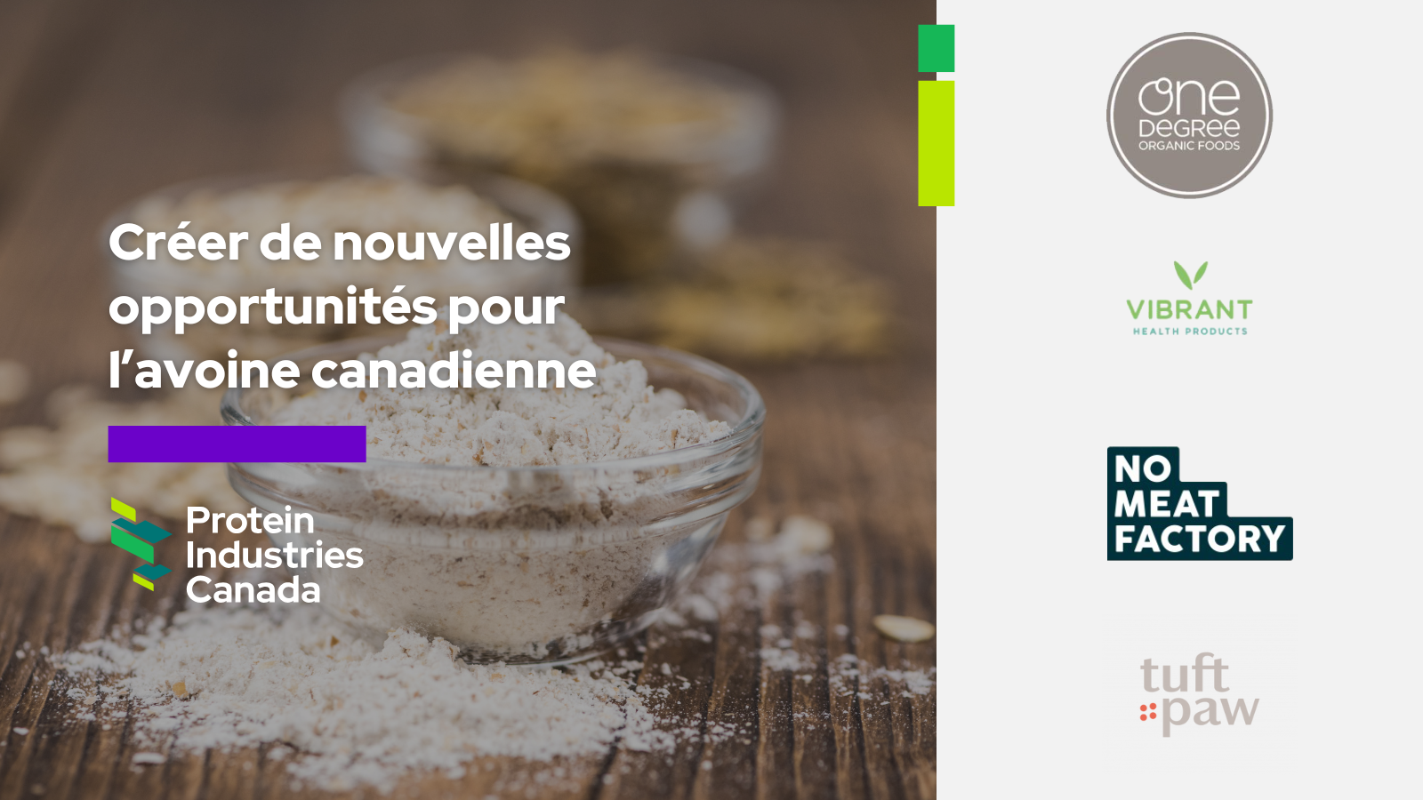 Vibrant Health Products Inc., société sœur de One Degree Organic, testera l'ingrédient protéique d'avoine en boulangerie. L'expansion des produits sous chacune de ses sous-marques permettrait à Vibrant Health d'élargir l'offre riche en protéines de ses gammes de produits à base de blé, sans gluten et à faible teneur en glucides, fournissant ainsi aux familles canadiennes les produits de boulangerie dont elles ont besoin pour répondre à divers besoins de santé.