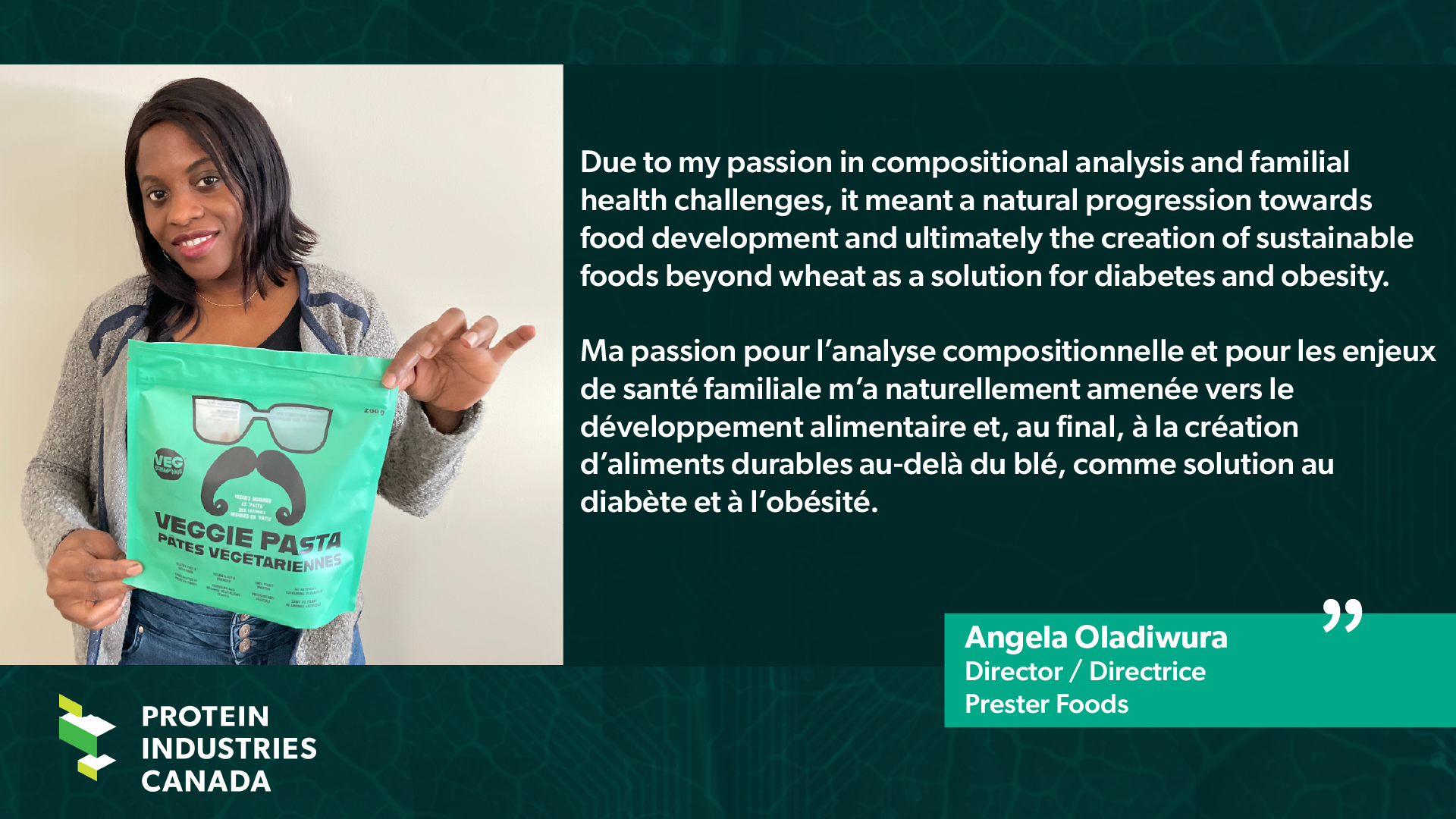 Ce qui motive Angela Oladiwura, c’est la résolution de problèmes. Or, elle s’est trouvée face au défi majeur de devoir changer de secteur lorsque les prix du pétrole ont chuté radicalement, il y a plusieurs années. Ce défi l’a menée vers le secteur canadien de l’alimentation humaine et animale et des ingrédients d’origine végétale.