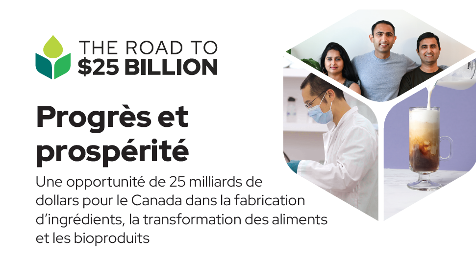 The Road to $25 Billion (feuille de route) est une feuille de route pour le secteur canadien de la fabrication d'ingrédients, de la transformation alimentaire et des bioproduits. Elle décrit les prochaines étapes nécessaires pour que le Canada saisisse cette opportunité économique, renforce sa chaîne d'approvisionnement et devienne un chef de file mondial en matière de solutions de sécurité alimentaire.